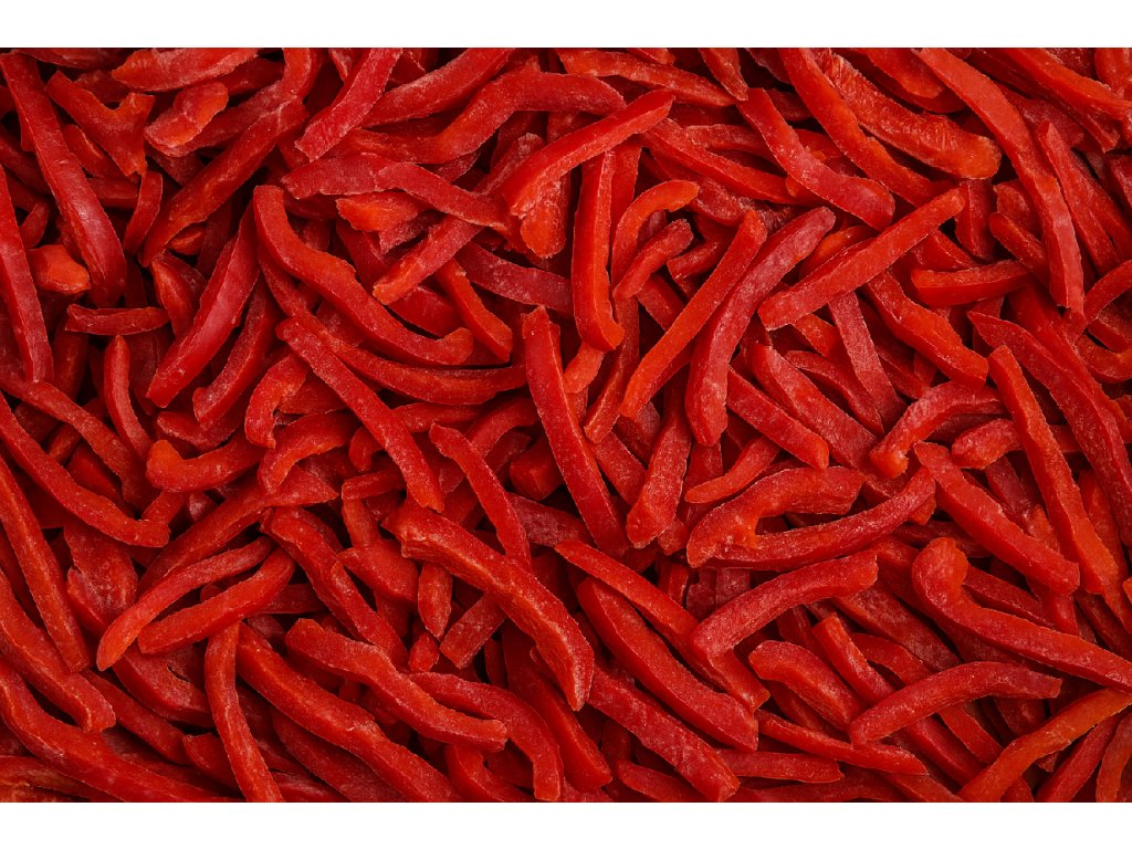 Mražená červená paprika nakrájená na praktické proužky, připravená k okamžitému použití.
